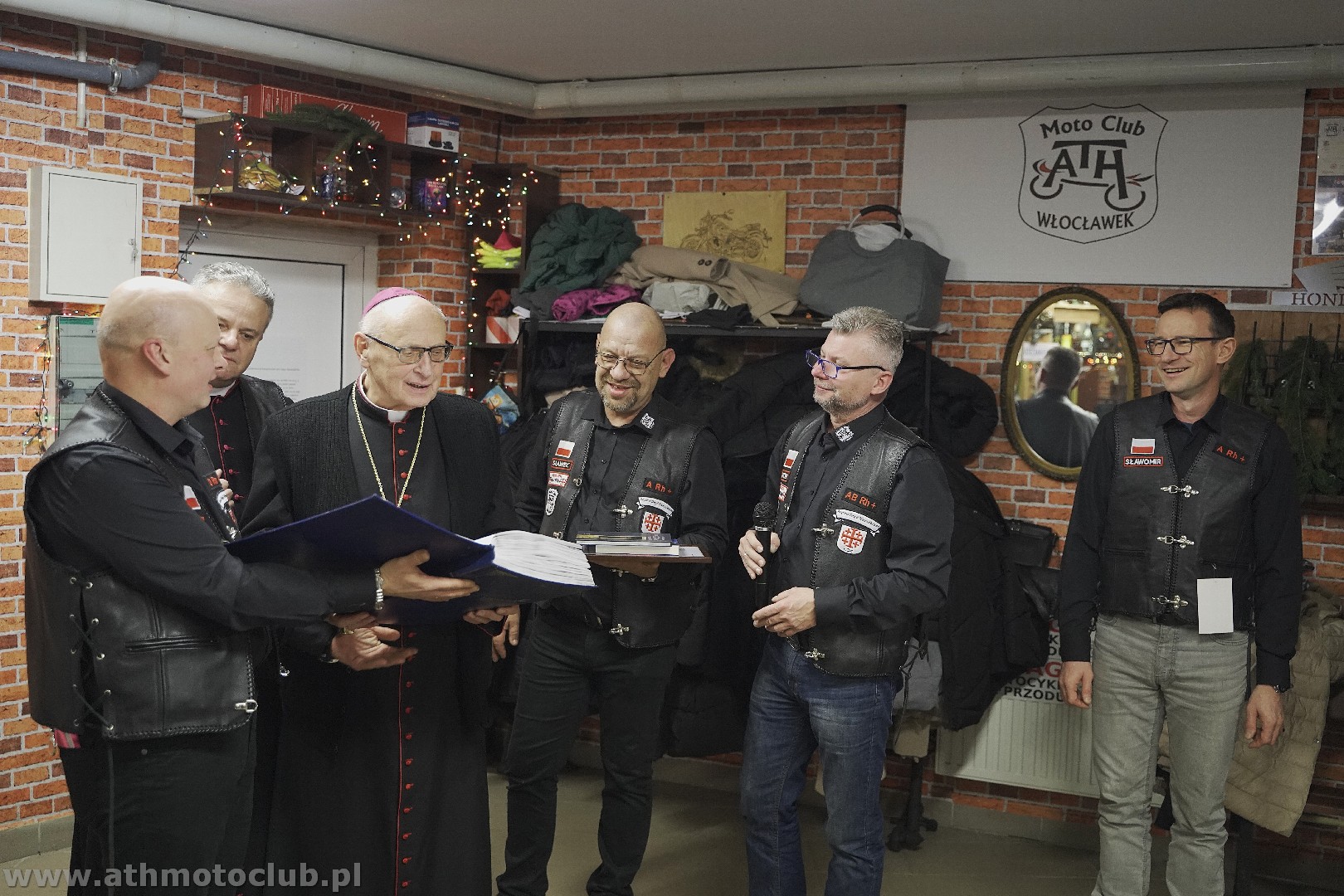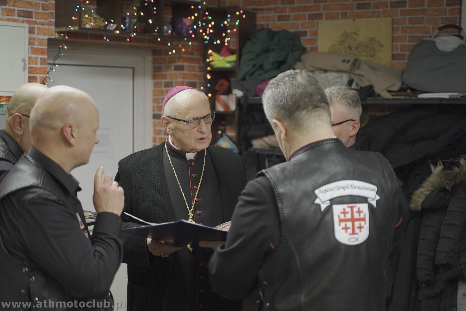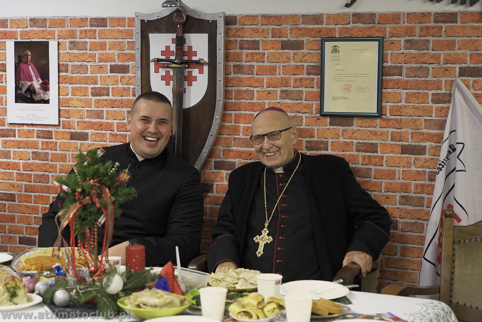 Wyjątkowym a jednocześnie tradycyjnym akcentem tegorocznej wigilii była wizyta honorowego Generała ATH – Jego Ekscelencji Księdza Biskupa Seniora Wiesława Alojzego Meringa, który od wielu lat darzy nas motocyklistów życzliwością i serdecznym słowem. Biskup Mering, na zaproszenie klubu, zaszczycił wigilię swoją obecnością, dzieląc się krótkim słowem duszpasterskim o znaczeniu wspólnoty, przyjaźni i pokoju i Boga w codziennym życiu każdego człowieka.