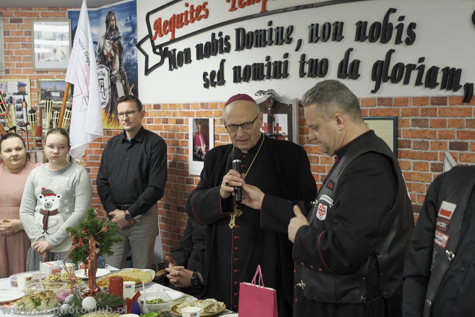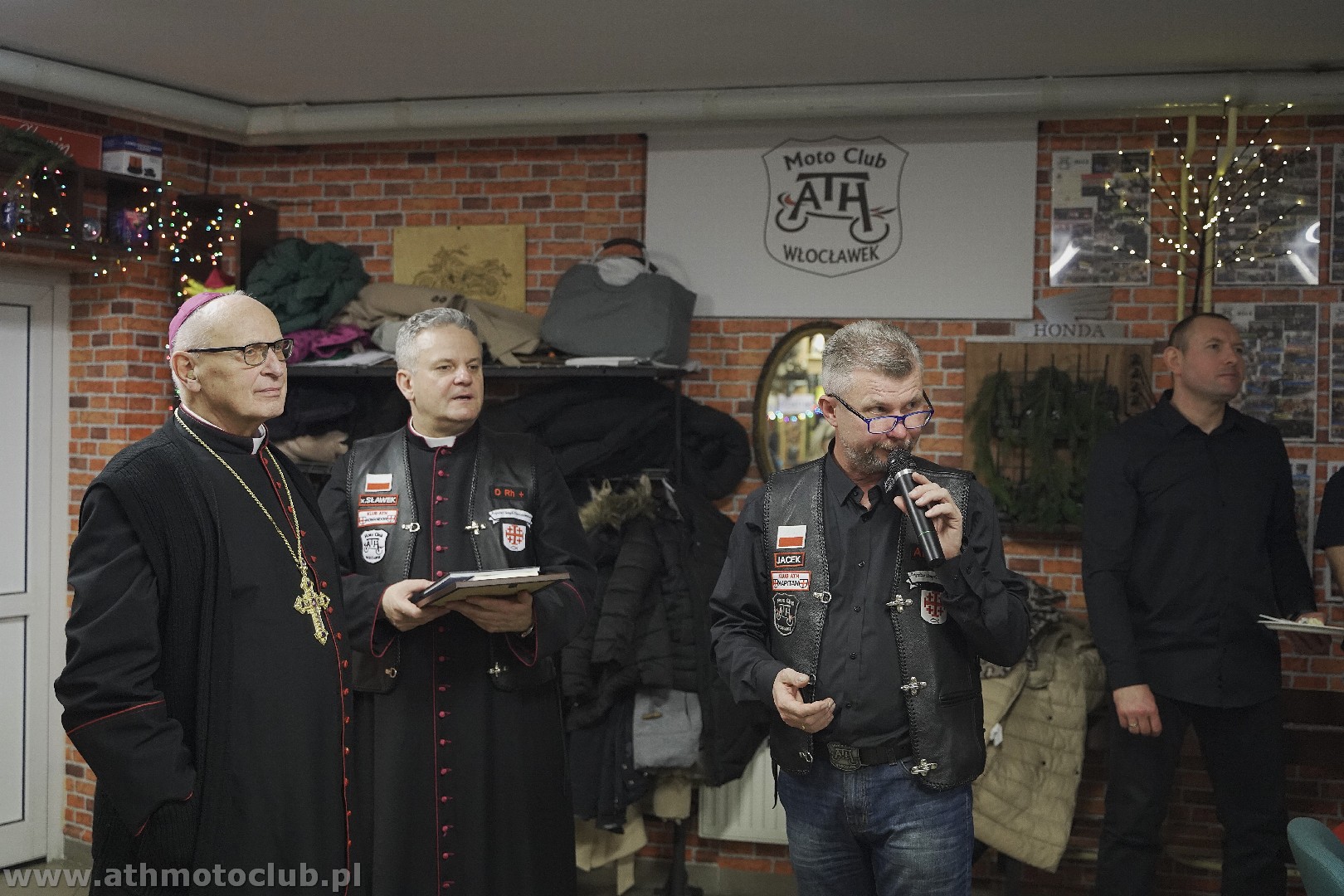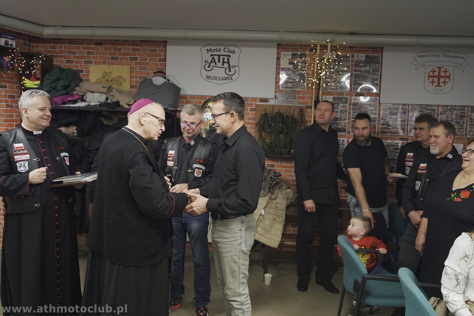 Wyjątkowym a jednocześnie tradycyjnym akcentem tegorocznej wigilii była wizyta honorowego Generała ATH – Jego Ekscelencji Księdza Biskupa Seniora Wiesława Alojzego Meringa, który od wielu lat darzy nas motocyklistów życzliwością i serdecznym słowem. Biskup Mering, na zaproszenie klubu, zaszczycił wigilię swoją obecnością, dzieląc się krótkim słowem duszpasterskim o znaczeniu wspólnoty, przyjaźni i pokoju i Boga w codziennym życiu każdego człowieka.