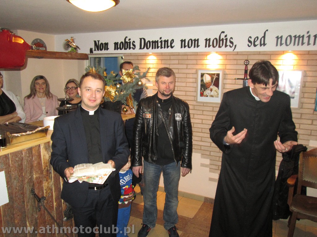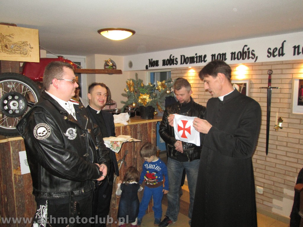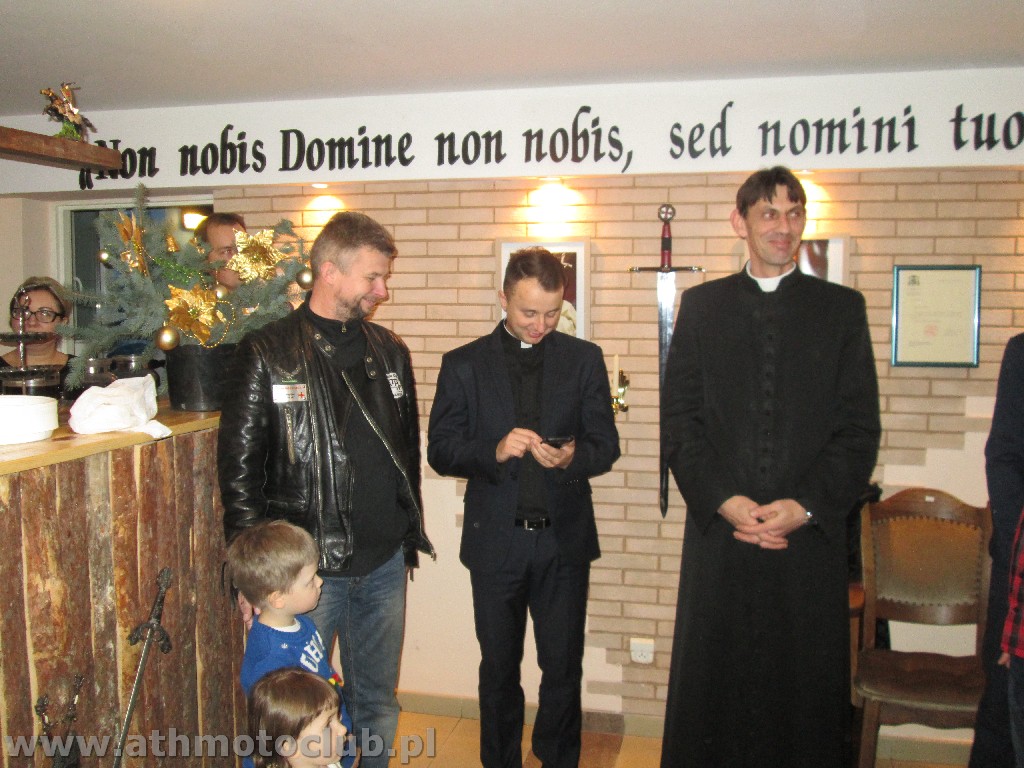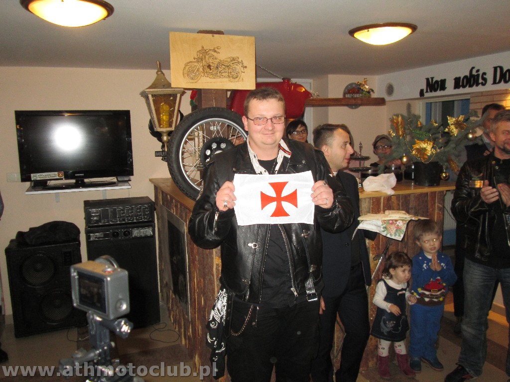Zbliżający się czas Bożego Narodzenia to okazja do spotkań w gronie rodzinnym by wspólnie przeżywać radość z przyjścia na świat Dzieciątka Jezus. To również okazja do spotkania w gronie klubowej rodziny ATH. 20 grudnia był szczególnie wyjątkowy gdyż oprócz spotkania przy wigilijnym stole odbyła się ceremonia mianowanie kolejnych Braci i Sióstr na wyższe stopnie rycerskie. W niedzielne popołudnie o godzinie 16:45 w Kościele Parafialnym św. Stanisława odbyła się Msza Święta, po której nastąpiła uroczystość pasowania naszych Braci. Pełne barwy klubowe odebrali Rycerze ATH : Brat Piotrek , Brat Rafał, Brat Robert. Mianowani do tarczy ATH czyli na stopień Giermka zostali Bracia Mirek, Czarek, Sławek, Artur, Paweł. Zaszczytu noszenia Tarczy ATH dostąpiły również żony i narzeczone naszych Braci. Po uroczystości przejechaliśmy do naszej Komandorii gdzie rozpoczęliśmy Wigilię od przeczytania przez naszego Brata xRafała Ewangelii św. Jana przypominającej Narodziny naszego Pana Jezusa Chrystusa ! Następnie zgodnie z Polską tradycja podzieliliśmy się opłatkiem i składaliśmy sobie wzajemnie życzenia …. Podczas trwania tej uroczystej chwili jeden z Naszych Pretendentów Arek otrzymał z rąk Komandora pierwszy stopień flagę ATH !Wszystkim nowo mianowanym gratulujemy, jednocześnie zapraszając do obejrzenia relacji foto z minionych wydarzeń.
